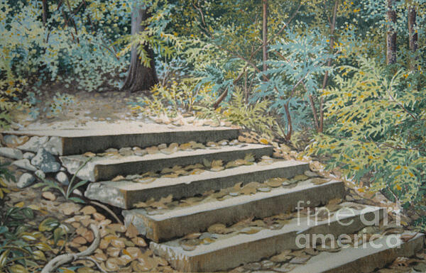 Stepping stones lead upwards through a lush, green forest setting with dense foliage. Fallen leaves... more