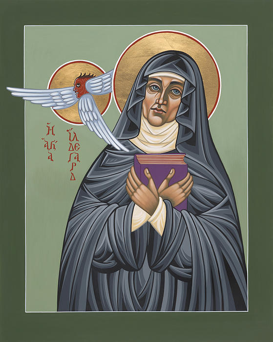 Father Bill's Hildegard of Bingen is a beautiful image of Hildegard holding a Bible or songbook, both signs of her important work as healer, theologian, musician.
